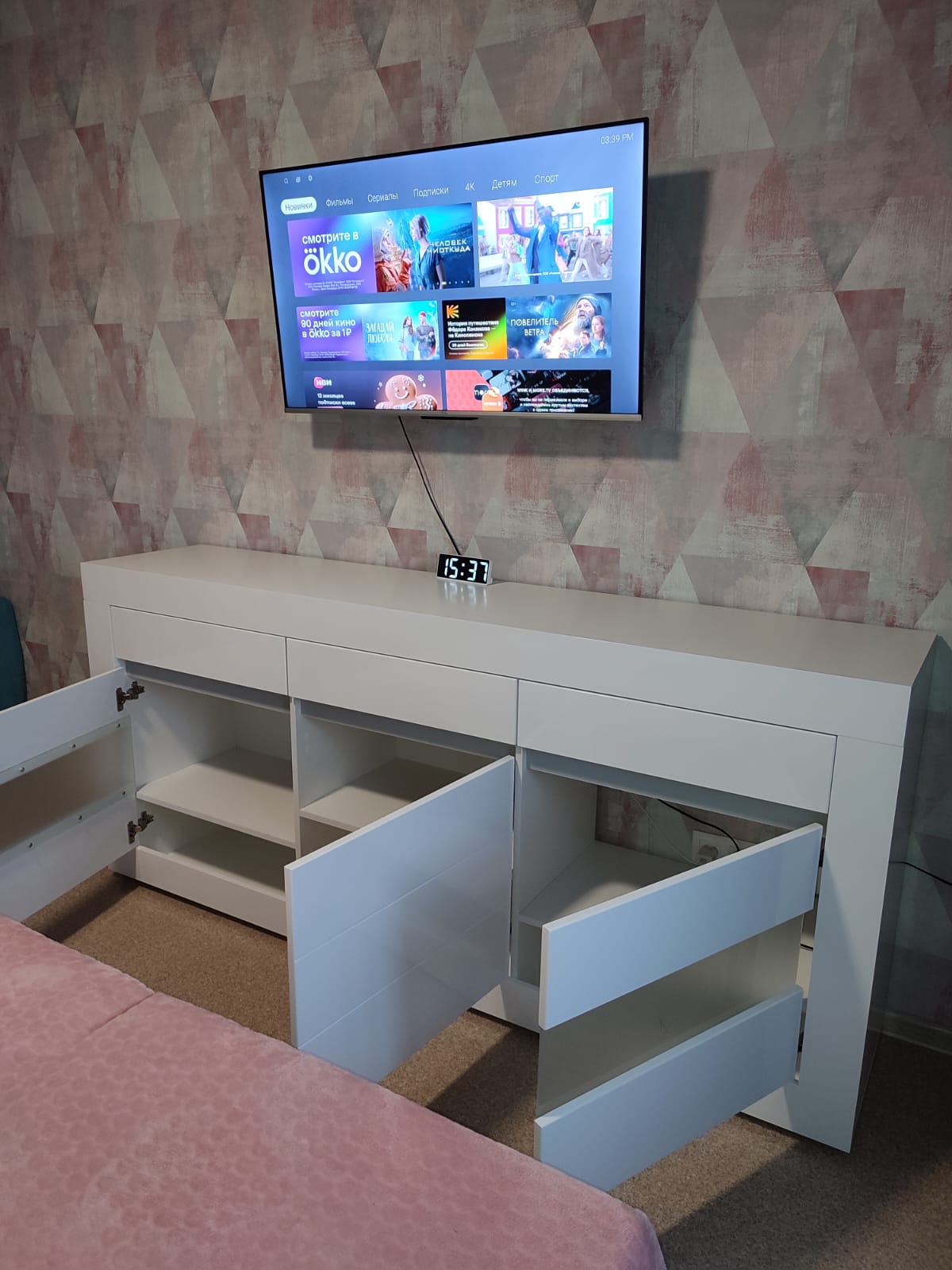 • Крайние дверцы со стеклом — эффектно разместят коллекции, книги, декор или любимые мелочи.