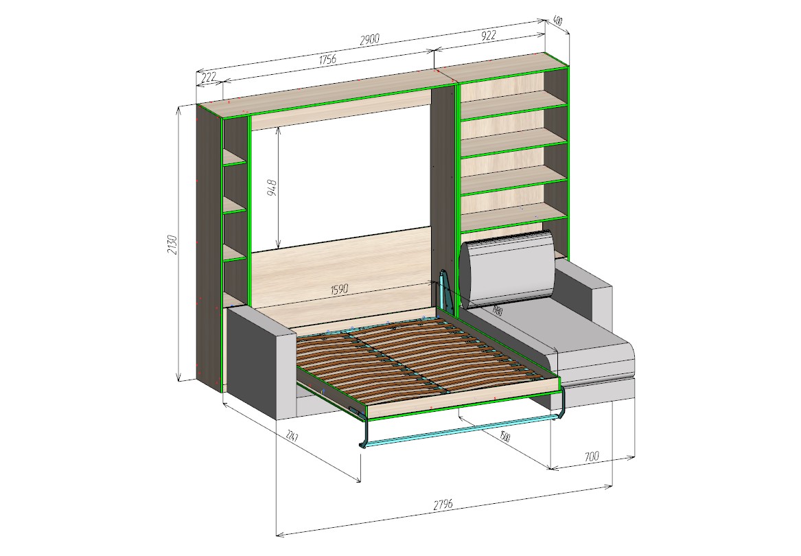 В сложенном виде модель выглядит как современный шкаф с открытыми книжными полками и угловым диваном, а при необходимости центральная часть легко трансформируется в кровать с помощью надёжного механизма.